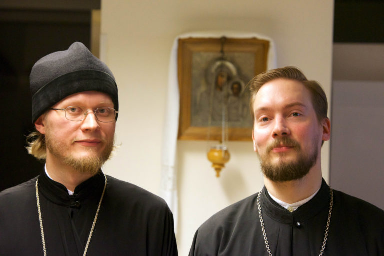 Pastori Joosef Vola ja pastori Sergei Petsalo papinvaalien jälkeen Helsingin seurakuntasalilla.