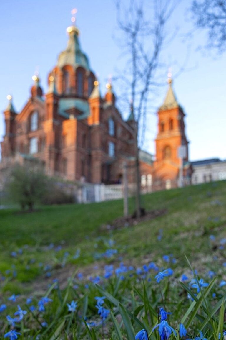 Uspenskin katedraali huhtikuun ilta-auringossa. Katedraalin rinteellä kukkii keväisin idänsinililjoja. Kuva: Khrystyna Martyniuk. Teksti: Vlada Wahlsten