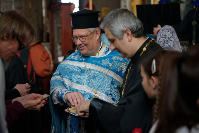 Helsingin ortodoksisen seurakunnan Kirkkoherra Markku Salminen on nyt Ekumeenisen istuimen rovasti. Liturgian päätteeksi hän jakoi Ekumeenisen Patriarkka Bartolomeoksen siunaamia ikonikortteja kirkkokansalle. Kuva: Kateryna Chyhryn
