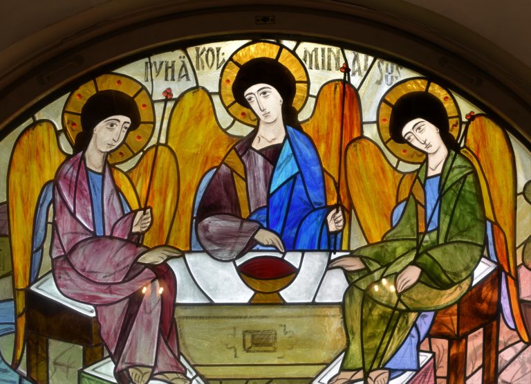Pyhä Kolminaisuus, lasimaalaus Tikkurilan ortodoksisella kirkolla. Kuva: Dimitri Tolonen