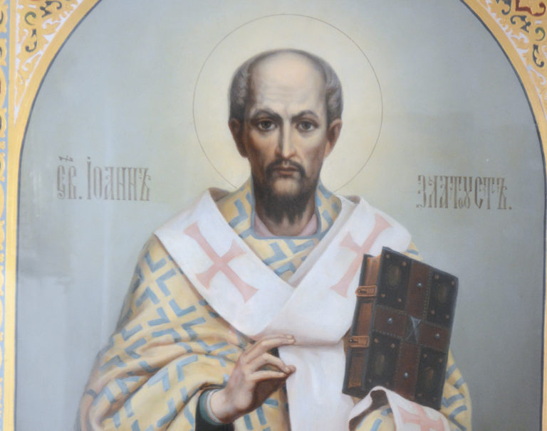 Pyhä Johannes Krysostomos kuvattuna Pappilatalon Kotikirkon ikonostaasissa. Kuva: Helsingin ortodoksinen seurakunta