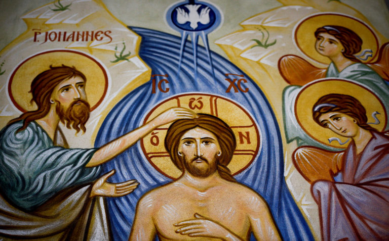 Kristuksen kaste kuvattuna Tapiolan ortodoksisessa kirkossa kastealtaan yläpuolella olevassa seinämaalauksessa. Kuva: Helsingin ortodoksinen seurakunta