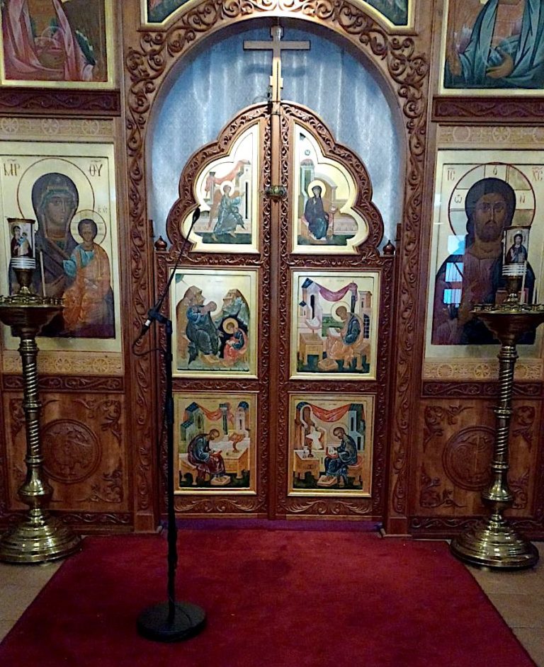 Ikonostaasin ja alttariovien edessä olevalla solealla on äänijärjestelmän uudistuksen myötä asennettuna kiinteä mikrofoni, jonka odotetaan parantavan kuuluvuutta kirkossa. Kuva: Mikael Sundkvist, Teksti: Vlada Wahlsten