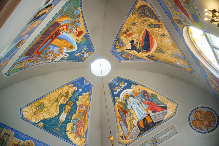 Kristuksen taivaaseenastumisen kirkon kattomaalaukset nostavat katseen ylös kohti taivasta. Idässä alttarin ja ikonostaasin yläpuolella on maalattuna Kristuksen ylösnousemuksen ikoni. Kuva: Kari Pekonen