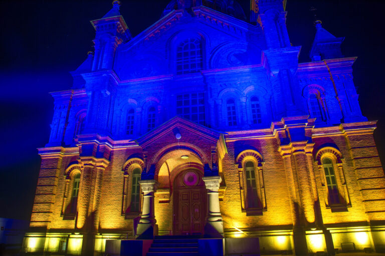 Успенський собор підсвітили в кольори українського прапора в березні 2022 року, невдовзі після початку війни. Фото Карі Пеконен
