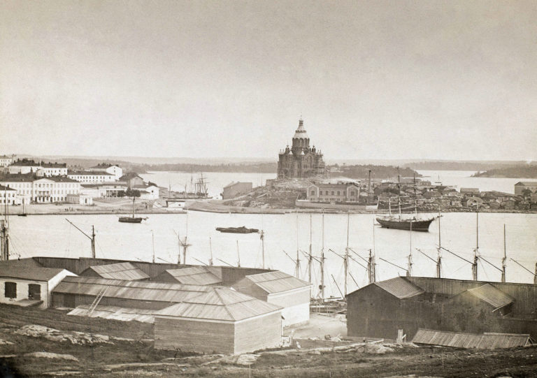 Uspenskin katedraali valmistumisvuonna 1868. Kuvassa näkymä Eteläsatamaan ja Katajanokalle. Uspenskin katedraali vihittiin käyttöön 25. lokakuuta 1868. Keisari Aleksanteri II:n toiveesta kirkko pyhitettiin Jumalanäidin kuolonuneen nukkumisen – uspenien – muistolle.