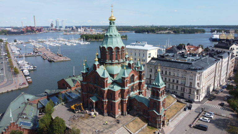 Uspenskin katedraalin kunnostustyöt näkyivät heti remontin ensimmäisenä päivänä 22.8. Kuva: Jukka Vehkaoja