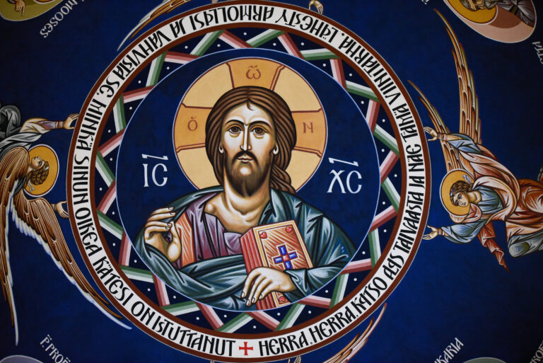 Herramme Jeesuksen Kristuksen ikoni Pyhittäjä Herman Alaskalaisen kirkon kupolissa. Ikoni-seinämaalauksen on maalannut ikonografi Alexander Wikström. Kuva: Joel Eklöv.