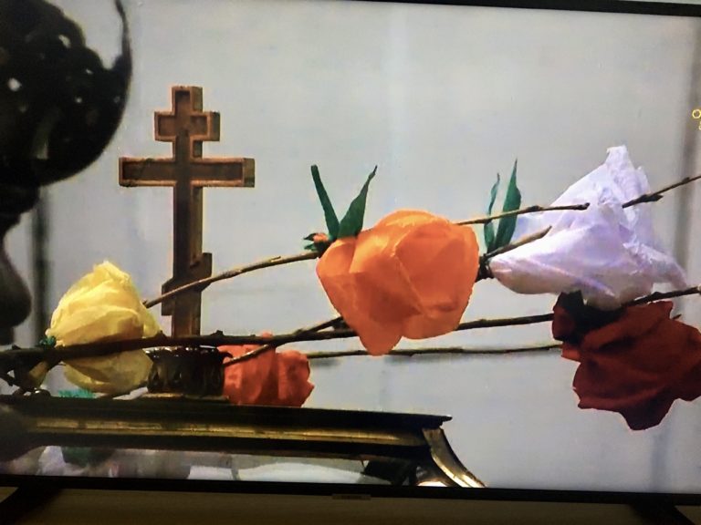Kuvakaappaus Uspenskin katedraalin verkkolähetyksestä palmusunnuntaina 5.4.2020.