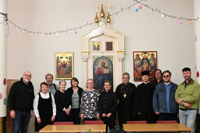 Valtuutetut yhteiskuvassa sääntömääräisen tilinpäätöskokouksen päätteeksi. Osa valtuuston jäsenistä joutui lähtemään aikaisemmin, ja kaikki valtuutetut eivät päässeet kokoukseen, joten kuvassa kaksitoista kaikkiaan 21 valtuutetusta. Kuvassa vasemmalta Markku Pelkonen, valtuuston varapuheenjohtaja Ritva Bly, Risto Murto, Anja Lindström, Maria Mountraki, Anna Soraniva, Ulla Saarinen, kirkkoherra Markku Salminen, Anatoli Lappalainen, Mika Kontkanen, valtuuston puheenjohtaja Jefim Brodkin ja Kim Kilpinen. Teksti ja kuva: Vlada Wahlstén