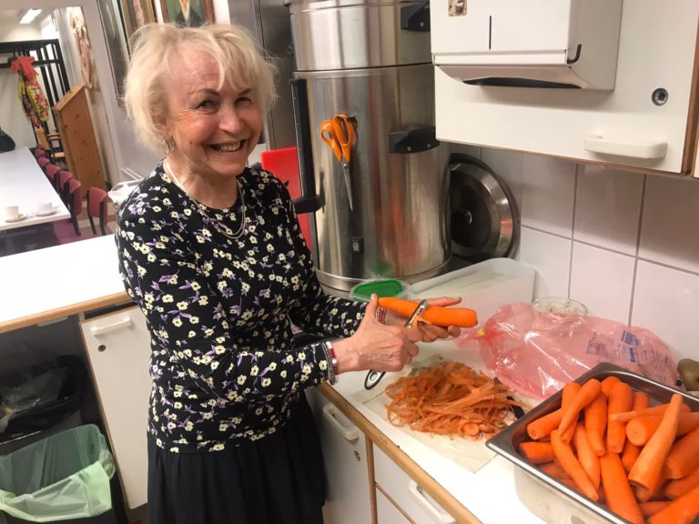 Vapaaehtoistoiminnasta on moneksi. Vapaaehtoinen Ulla Pesola auttaa diakoniaruokailun valmistelemisessä Helsingin seurakuntasalilla. Kuva: Helsingin ortodoksinen seurakunta